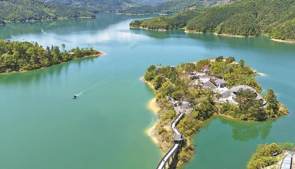 4月19日,游客乘坐游船在福州市连江县小沧畲族乡观光游玩,乐享春日畲乡山水美景。