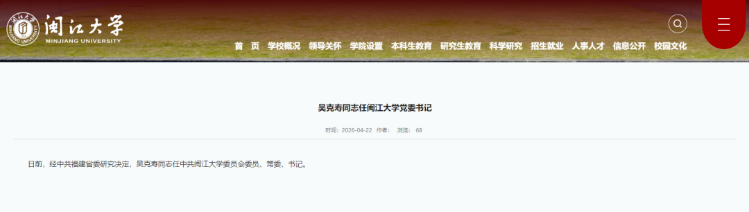 日前,经中共福建省委研究决定,吴克寿同志任中共闽江大学委员会委员、常委、书记。